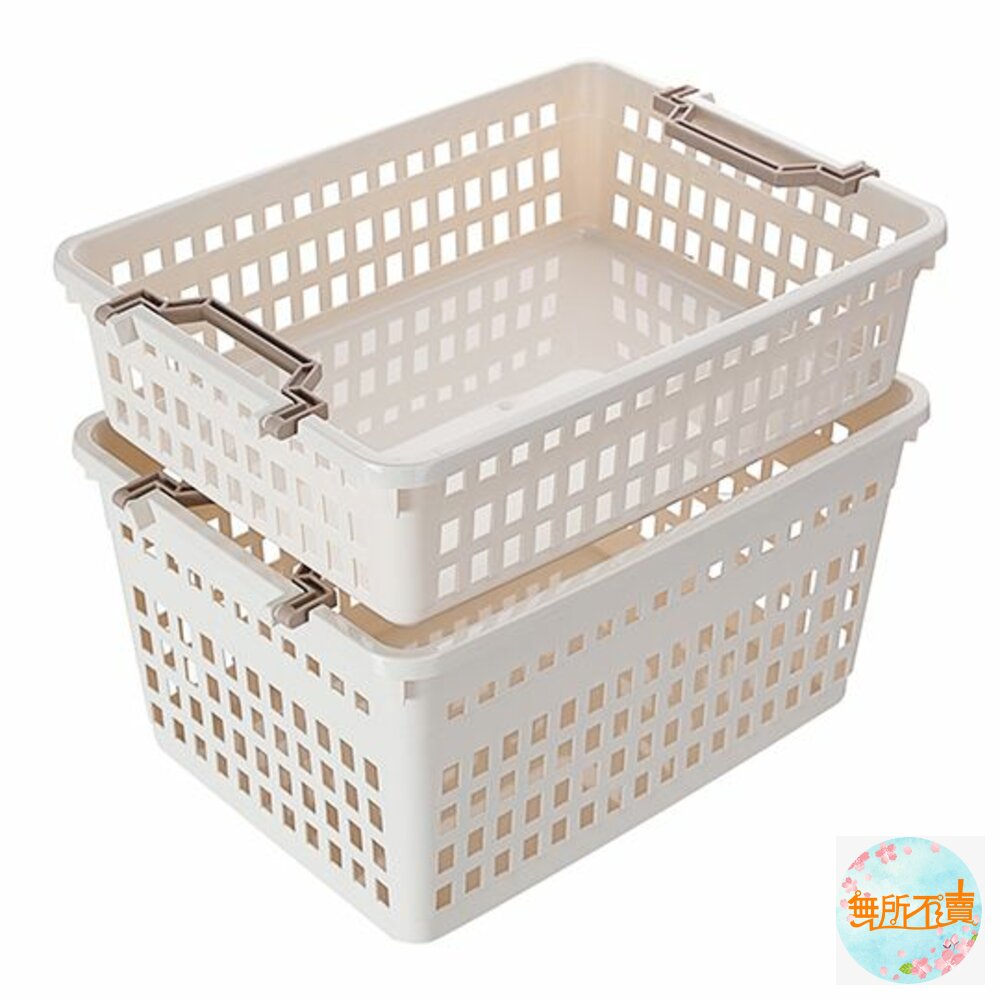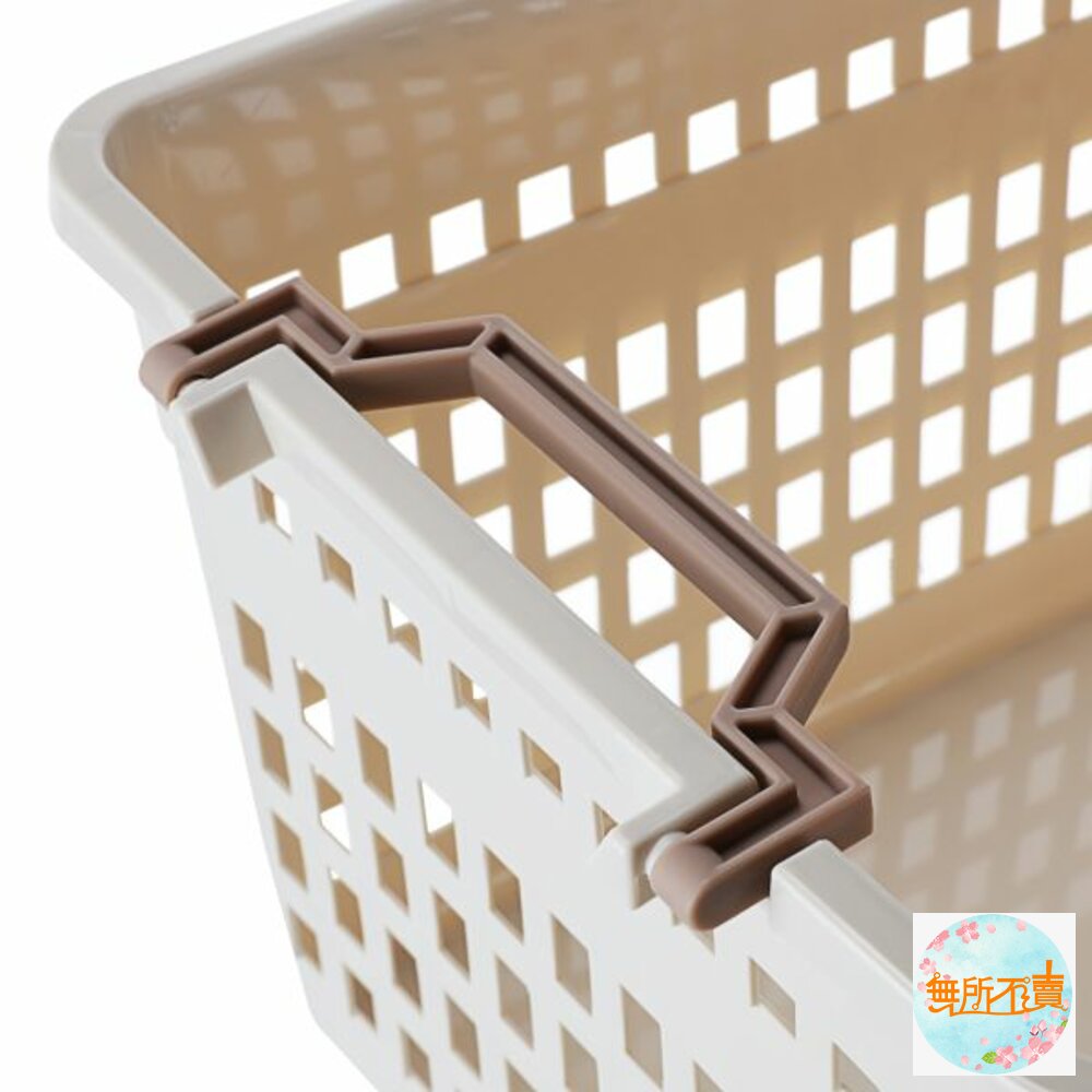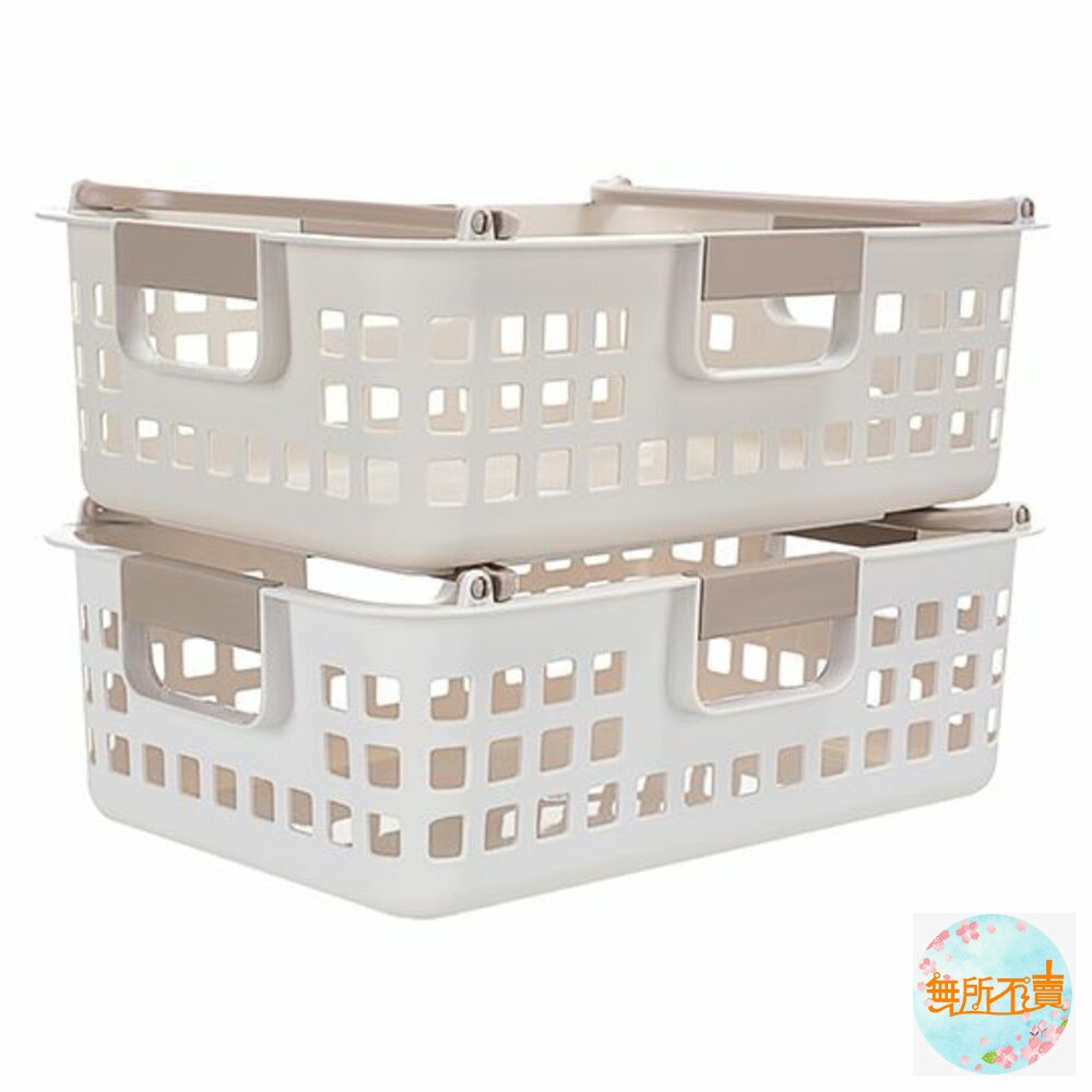 產品特色簡約大方色調,適用於各式雜物的放置,側面為方孔設計,通風透氣,四面手把設計,便於拿取,兩邊提把往內固定,不同尺寸之產品,方可作輕便堆疊;亦可堆疊收納,節省空間,可搭配鐵架、系統櫃使用,有各式尺寸,可供選擇。