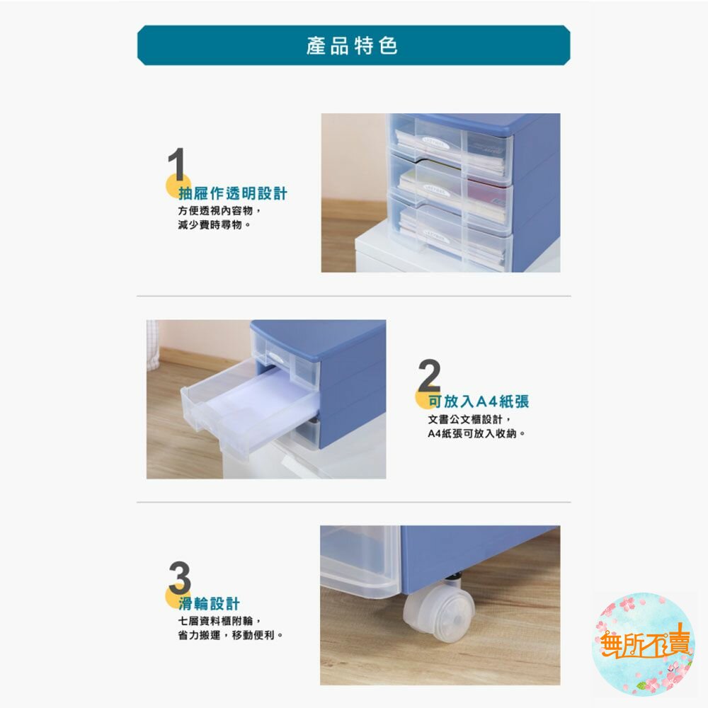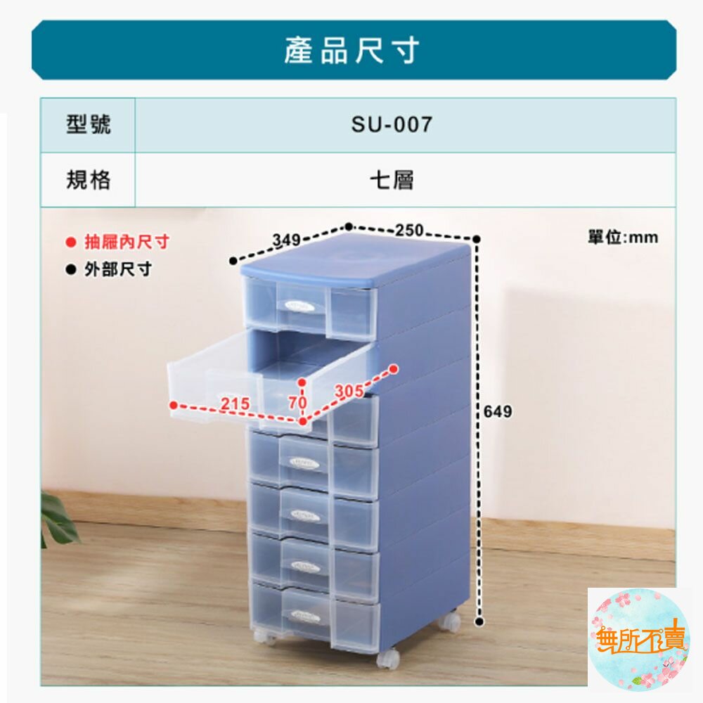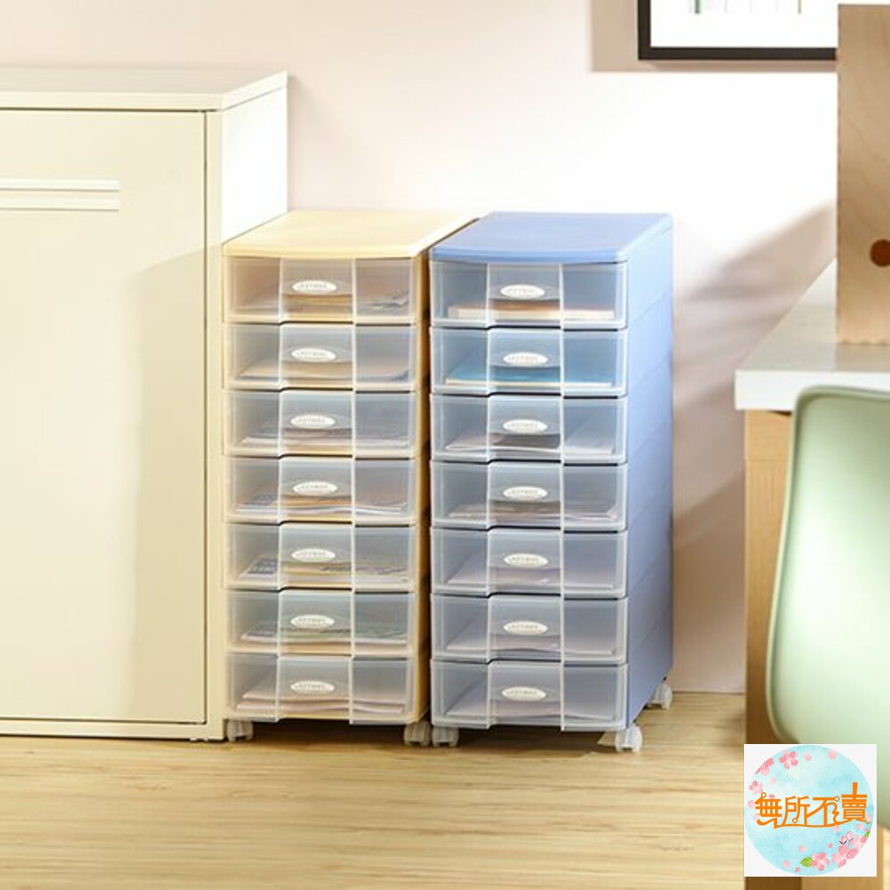 其中七層櫃附輪子(SU007),方便移動,幽雅藍、柔和米,可供挑選。