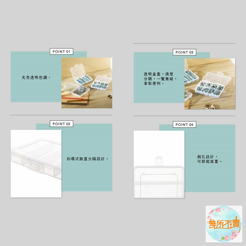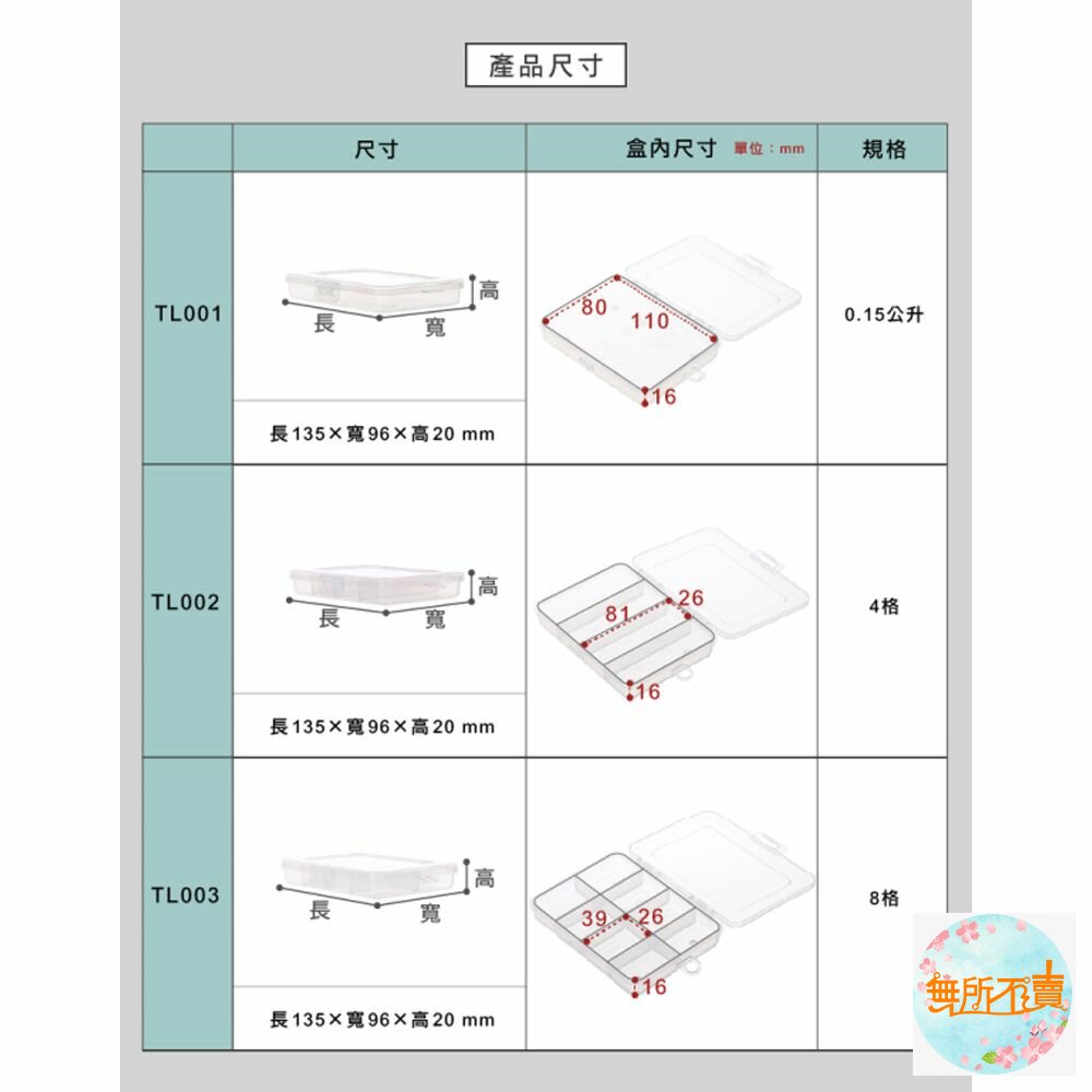 光亮透明,扣環式掀蓋分隔設計,透明盒蓋,清楚分類,一覽無遺,拿取便利,洞孔設計,可掛起放置;適用於零件、文具、手工藝品等各式小物,亦可層層堆疊,有三種樣式,可供選擇,其中A型(TL001),並無分格,B型(TL002)為4分格,C型(TL003)為8分格。