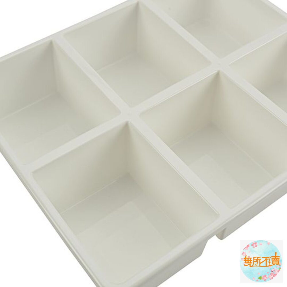 TLR-106 你可6格收納盒 產品編號:TLR106 尺寸:238x290x63mm 超取限制數量:12個 產品特色 皎潔淨白色系,分格式收納盒,適用於文具、飾品、餐具等各式小物之收納,可搭配抽屜、衣櫃使用; 亦可堆疊收納,有四種不同分格、大小之產品,可供選擇。