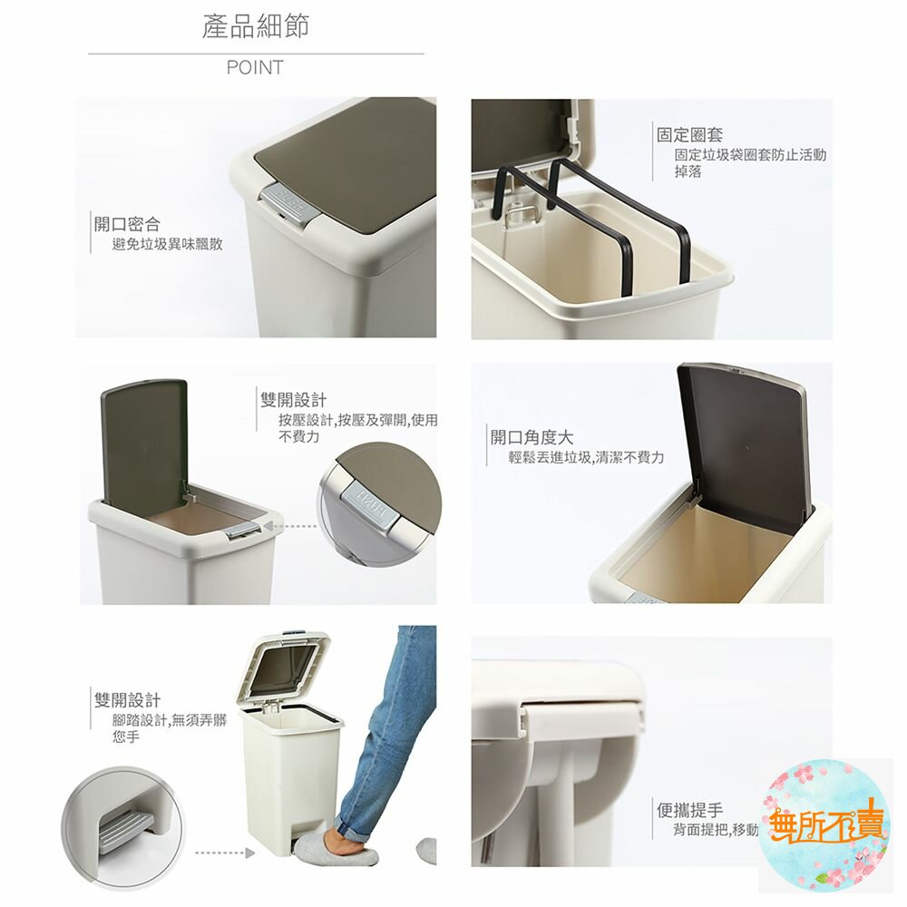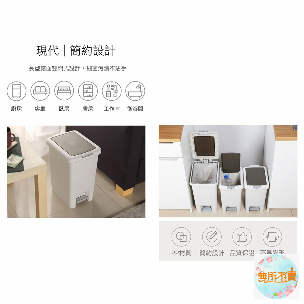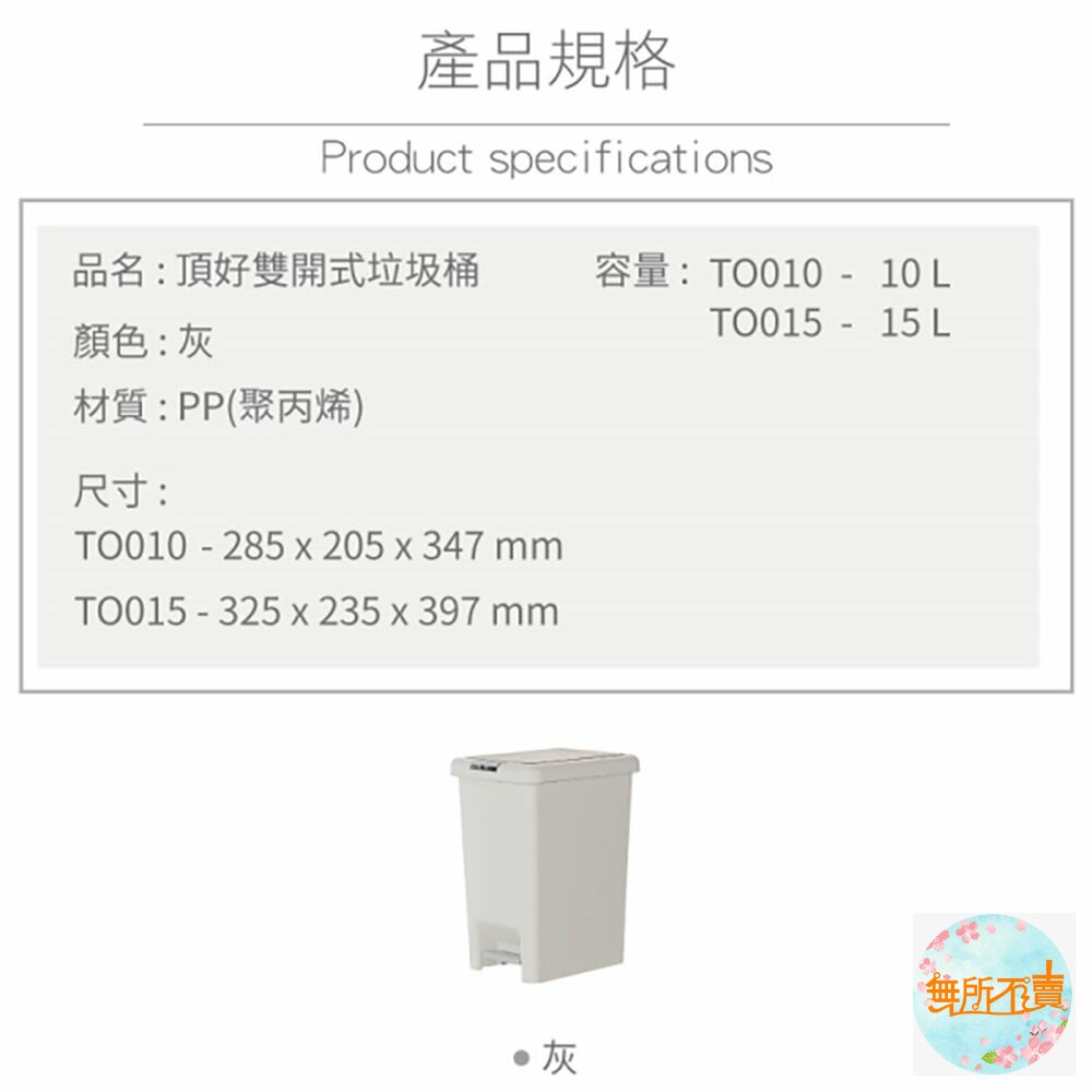 TO-010頂好10L雙開式垃圾桶 產品編號:TO010 尺寸:285x205x347mm 產品特色 長型霧面設計,沉穩素雅的灰色調,按壓式、防滑踏式之雙開設計,內有壓條,可固定垃圾袋;有兩種尺寸,可供選擇。