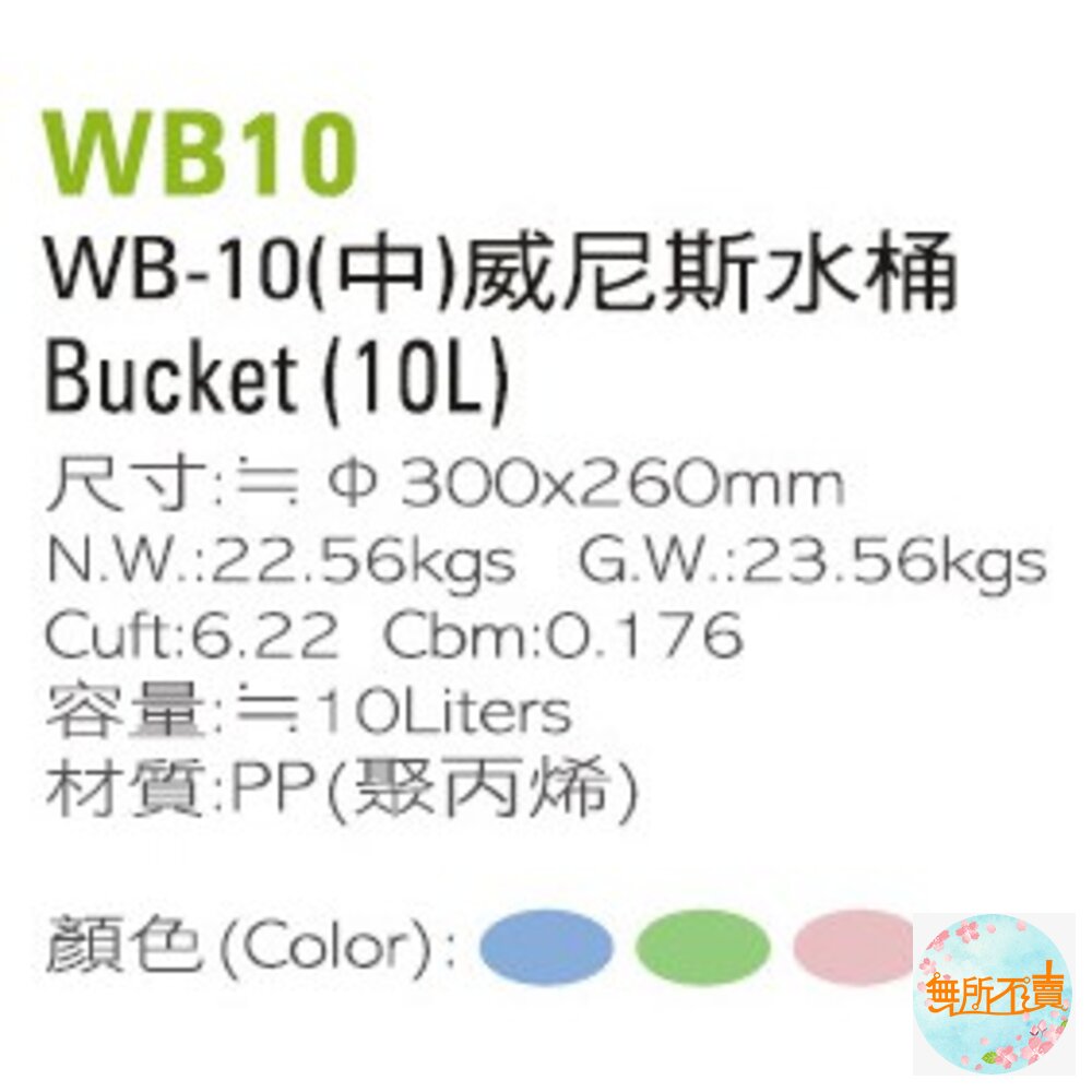 WB-10(中)威尼斯水桶 產品編號:WB10 尺寸:300x300x260mm 產品特色 半透明設計,握把作結構強化,更堅實耐用,貼心細膩的握把設計,符合人體工學,拿取更舒適,凹口設計,方便倒水,亦可堆疊收納;有兩種尺寸,活力淺綠、幽雅淺藍、浪漫粉紅,可供選擇。