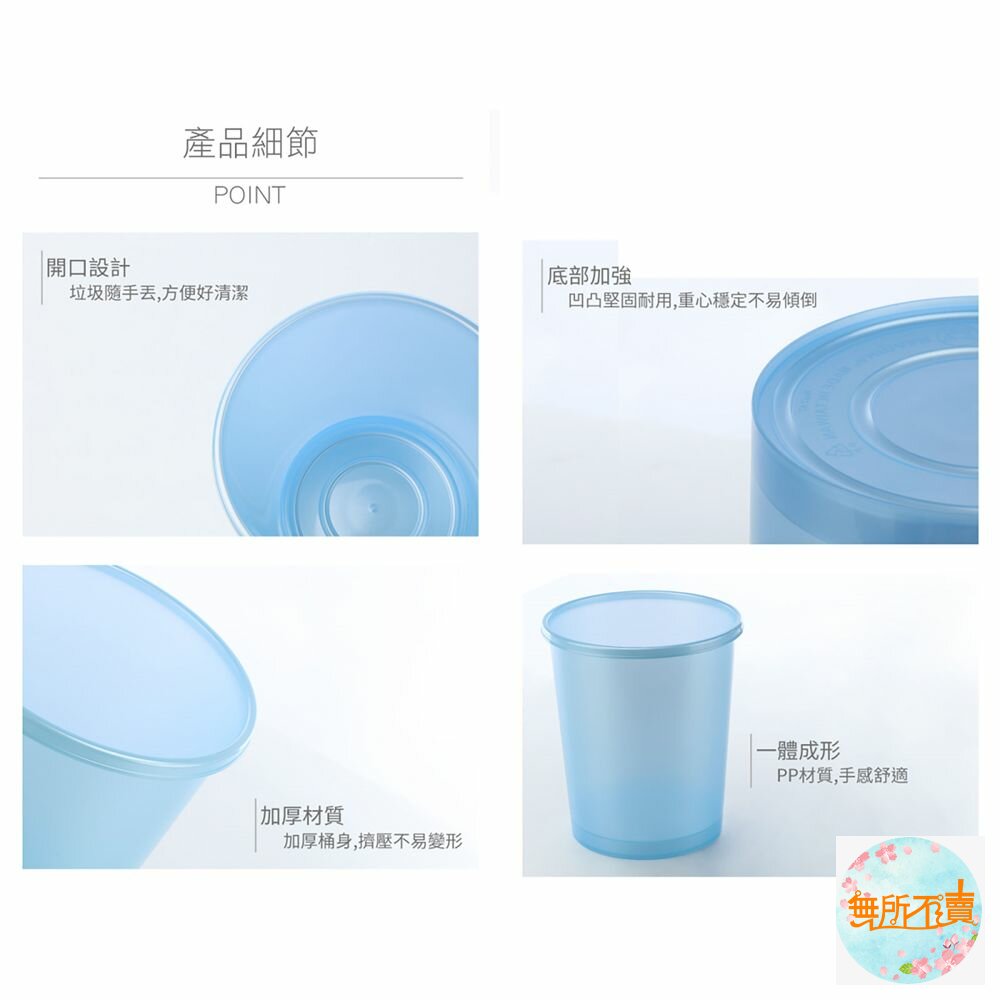 Y737(大)珠光花語垃圾桶 產品編號:Y737 尺寸:256x256x270mm 容量:9.5 Liters 顏色: 藍.粉.綠 產品特色 簡便丟垃圾,圓型設計,珠光亮面表層,有各式大小之產品,可供選擇;活力綠、浪漫紅、自由天藍色,任君挑選。