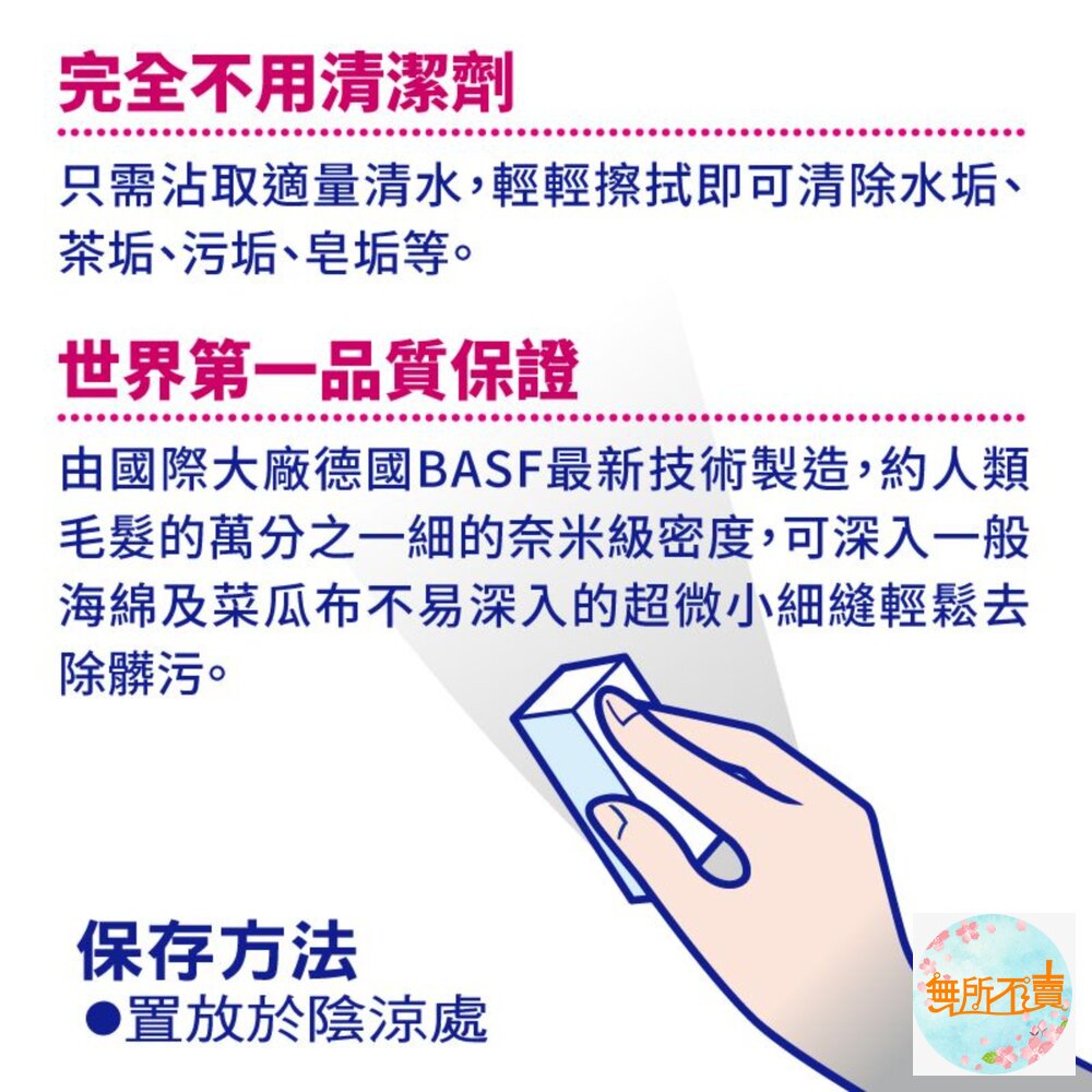 完全不用清潔劑,只需沾適量清水,輕輕擦拭即可清除水垢,茶垢,污垢,皂垢等,可說是污垢剋星。