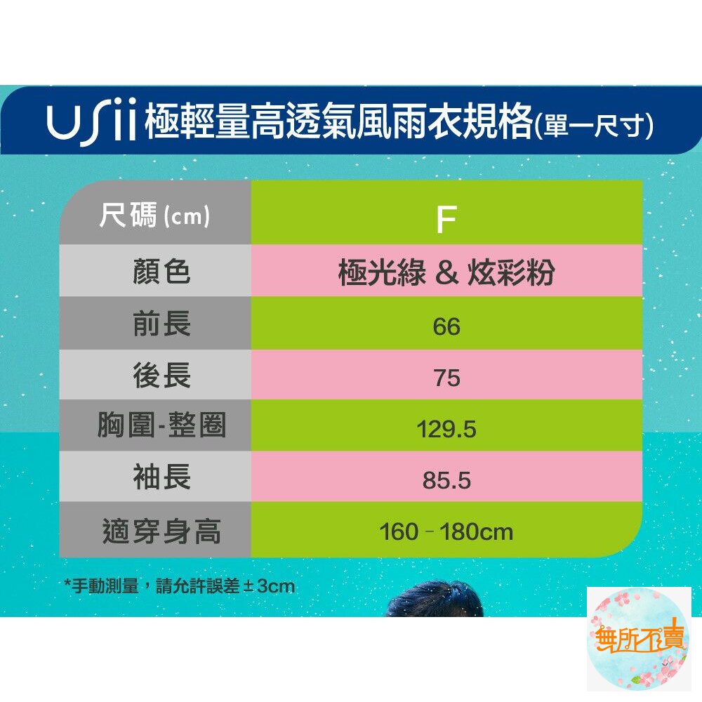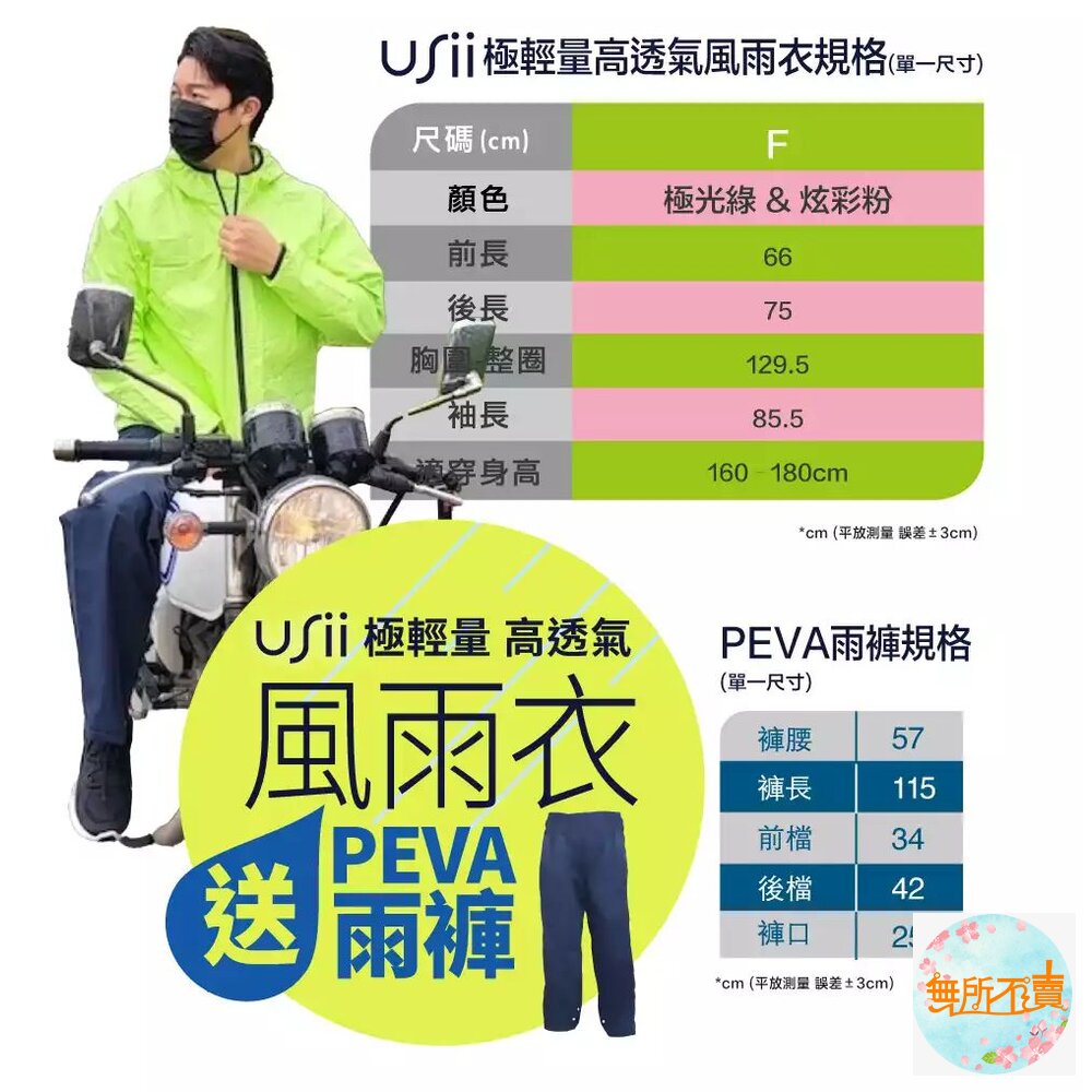 ◆不含塑化劑:USii透氣雨衣不僅強調台灣料、台灣生產,並且不使用塑化劑,雨衣既沒有塑膠臭味,也不會威脅肌膚健康,您可以放心穿著。